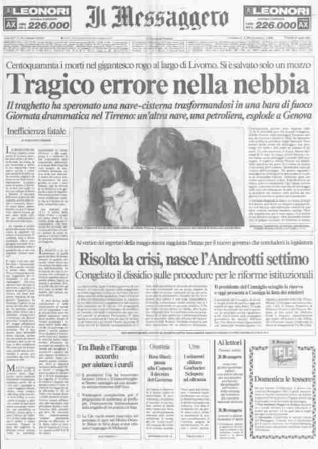 Le contraddizioni di una ricostruzione equivoca e frettolosa, i misteri della petroliera, dei ritardi nei soccorsi, delle manomissioni sulle navi e di cause ancora più oscure da diradare. L’ombra di una bomba sul traghetto, di traffici d’armi in rada, di poteri occulti che negoziano una verità di comodo.
